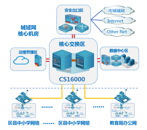CS16000系列交换作为教育城域网的交换中心,承担各中心校网络、教育局局域办公网、数据中心的接入和转发,并顺利获得安全出口区与市城域网等外网互通。